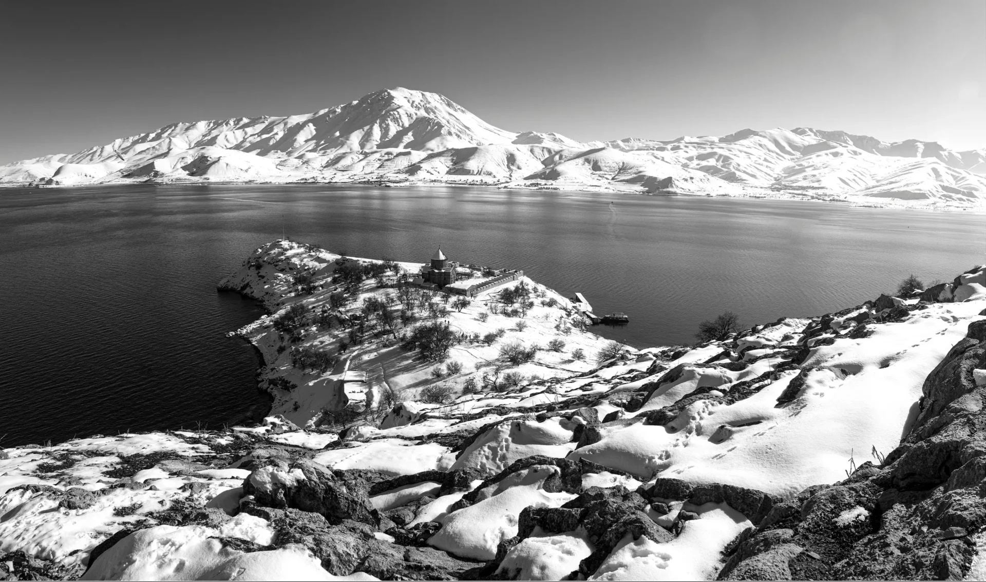 Van Gölü’nün ortasında, kış mevsiminin büyüsüyle bembeyaz bir sessizliğe bürünmüş. Bu siyah beyaz kare, Ada’nın doğal güzelliklerini ve tarihî dokusunu bir araya getiriyor. Karla örtülmüş ağaçlar ve kayalık formlar, gölün dinginliğiyle birleşerek izleyiciye zamansız bir manzara sunuyor. Uzakta zarafetle yükselen tarihi kilise, Akdamar’ın kültürel mirasını gözler önüne seriyor. Fotoğraf, yalnızca bir manzarayı değil; zamanın ağır akışını, doğanın dingin güzelliğini ve insanın içsel yolculuğunu yansıtıyor. Bu kare, Ada’nın büyüleyici atmosferini ve kışın yarattığı görsel şiiri ölümsüzleştiriyor.